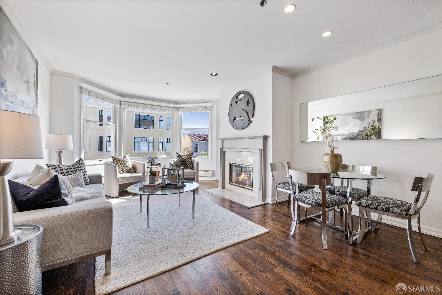Ideally located in the heart of the Marina, this stylish light-filled condo in a boutique building is loaded with desirable amenities: in-unit laundry, common roof deck, garage parking w/interior access, deeded storage & elevator. Upon entry, you are drawn to the south-facing bay windows offering tons of light & peekaboo views. Open concept living/dining room features fireplace, recessed lighting, crown moldings & tall ceilings. Kitchen flows openly into the dining area and has plenty of counter space & crisp white ceiling-high cabinets. Brand new stainless steel appliances just installed. Laundry closet with stacked washer & dryer. Renovated in 2019, the bathroom is thoughtfully accessible from both the living area & bedroom, offering convenience for guests and privacy for you. A locking door separates the washroom from the bath/shower, with a stylish vanity in each. The oversized bedroom includes a home office area. Storage space is maximized in the two large wardrobe closets with custom organizers plus a hall closet. Built in 1992 & professionally managed. Minutes from all of the dining, shopping & recreation the Marina is known for: the Marina Green, Chestnut St, the Palace of Fine Arts & Crissy Field. There's no better place to call home.